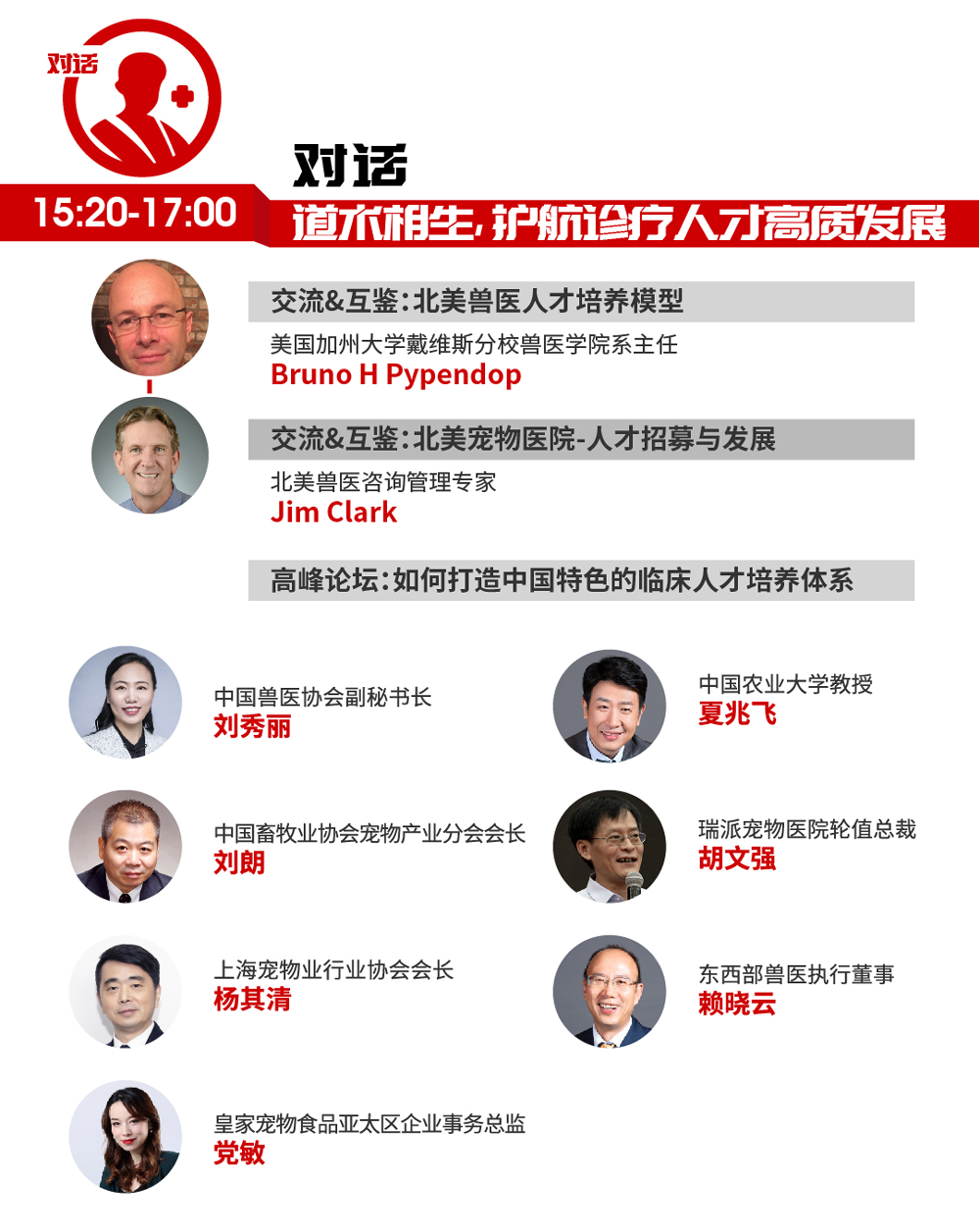 皇家始终高度关注兽医师人才培养,并持续将互惠理念融入行业发展和人才赋能。在第五届兽医师峰会上,皇家将邀请美国加利福尼亚大学戴维斯分校的兽医学院系主任Prof. Bruno H Pypendop深度剖析北美兽医人才培养模型,北美兽医咨询管理专家Dr. Jim Clark分享北美宠物医院的人才招募与留存;并以交流与互鉴的深度对话,从协会、高校、医院、企业端探讨具有中国特色的临床人才培养体系,探究兽医人才领导力的培养机制,建设适合我国诊疗大环境的人才专科化体系,见证未来行业新领袖的崛起。