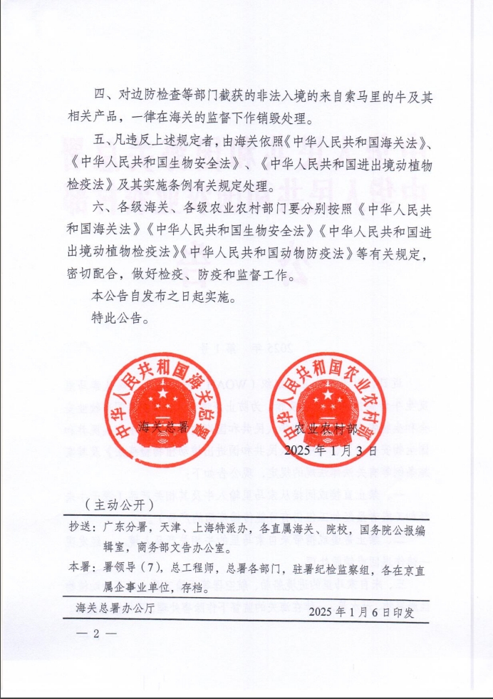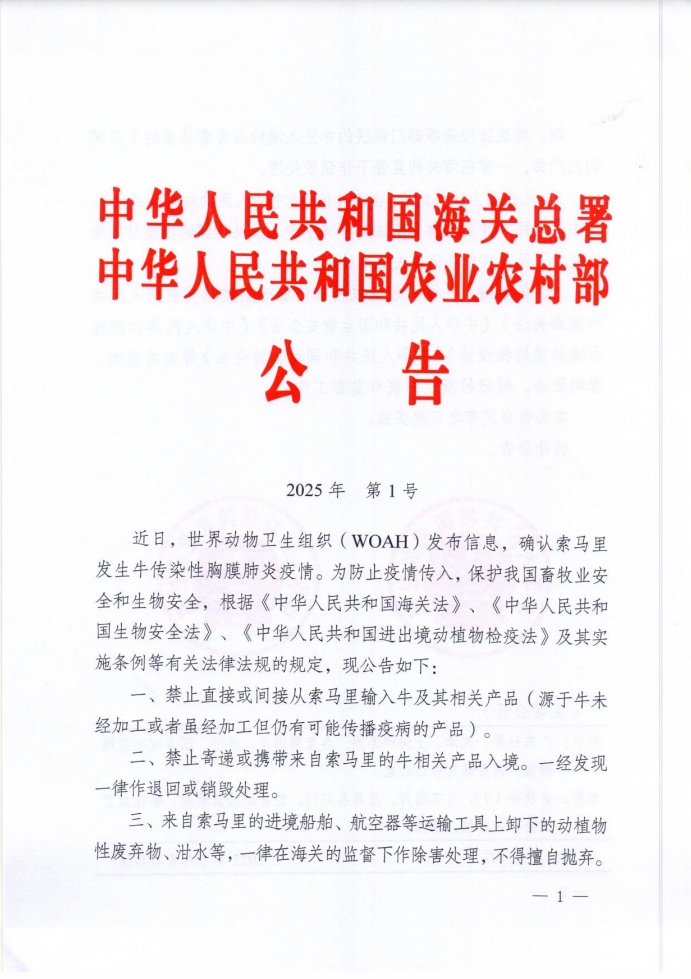 近日,世界动物卫生组织(WOAH)发布信息,确认索马里发生牛传染性胸膜肺炎疫情。为防止疫情传入,保护我国畜牧业安全和生物安全,根据《中华人民共和国海关法》、《中华人民共和国生物安全法》、《中华人民共和国进出境动植物检疫法》及其实施条例等有关法律法规的规定,现公告如下: